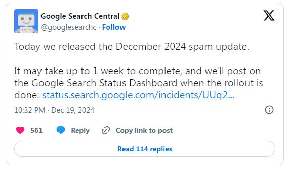 - Google’s December 2024 Spam Update will be fully implemented within a week.